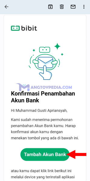 6. Lalu buka Email dari Bibit dan ketuk tombol Tambah Akun Bank untuk mengkonfirmasinya.